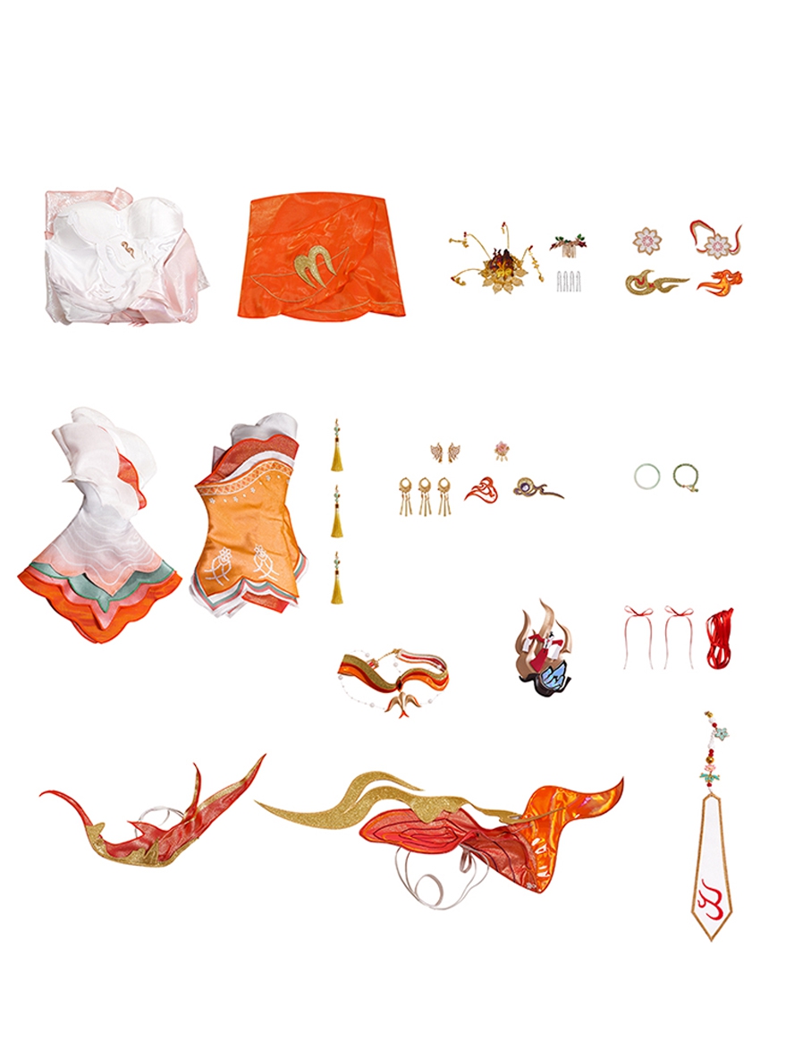 Include: Dress, Skirt, Sleeves*2+Tassel Pendants*3, Flying Sleeve Shawls*2, Bracelet*1+Anklet*1, Hair Ropes*3, Hair Accessories*8, Neck Strap*1, Chest Ornament*1, Waist Chain Pendant*1, Leg Embroidery Stickers*4, Hair Crown+Hairpin Set