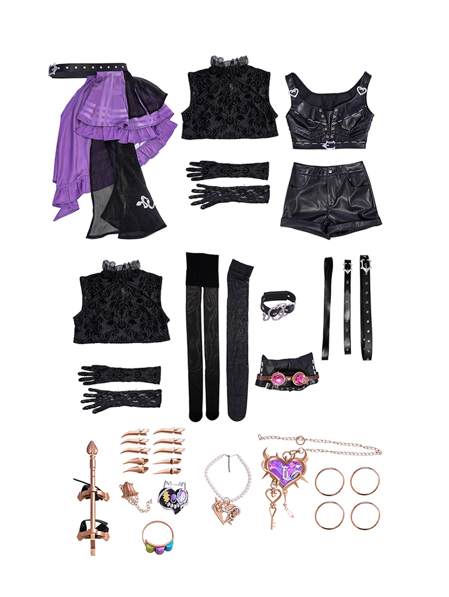 Include: Lace Vest*1, Leather Vest*1, Leather Pants*1, Skirt*1, Belts*3, Gloves*2, Hat*1, Snake Arm Ring*1, Waist Lock Chain + Necklace + Bracelets*4, Remote Control + Back Morning Glory + Back Battery Box + Arm Rod + Finger Props*10